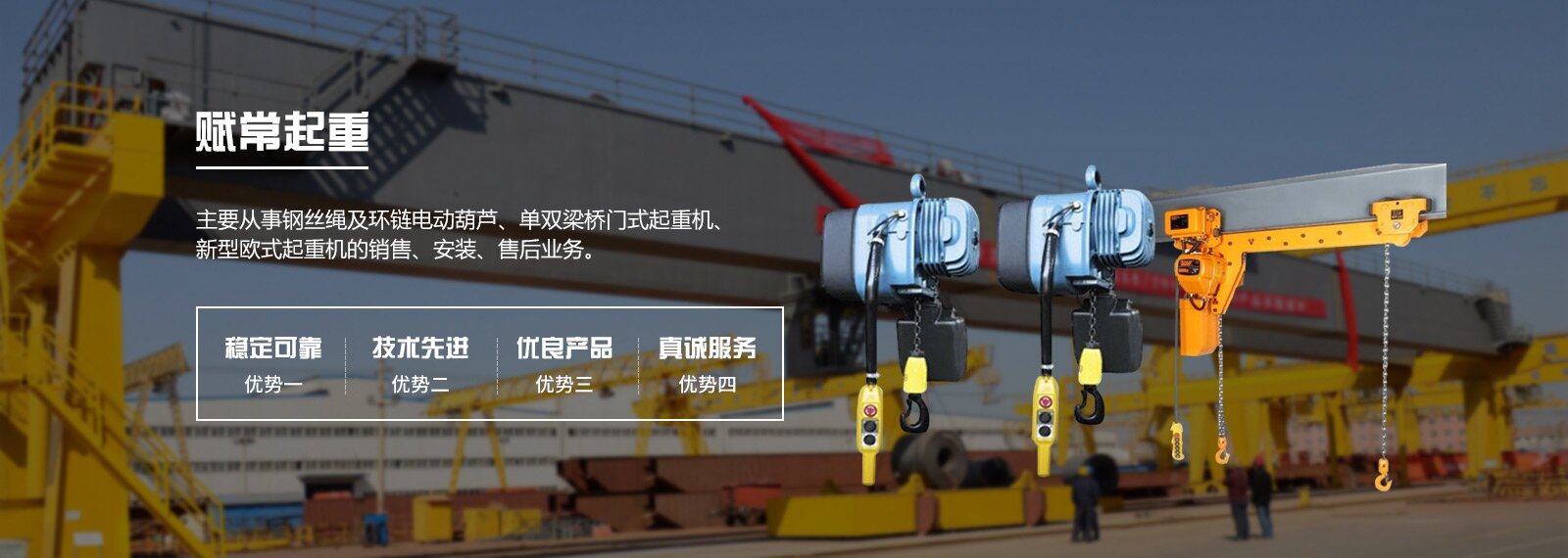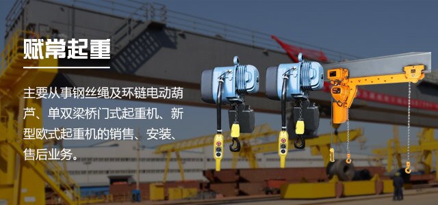 上海賦常起重機(jī)電設(shè)備有限公司主要從事鋼絲繩及環(huán)鏈電動(dòng)葫蘆、單雙梁橋門(mén)式起重機(jī)、新型歐式起重機(jī)的銷(xiāo)售、安裝、售后業(yè)務(wù)。廣泛應(yīng)用于機(jī)械、治金、電力、港口、造船、鐵路、化工、石材等領(lǐng)域。